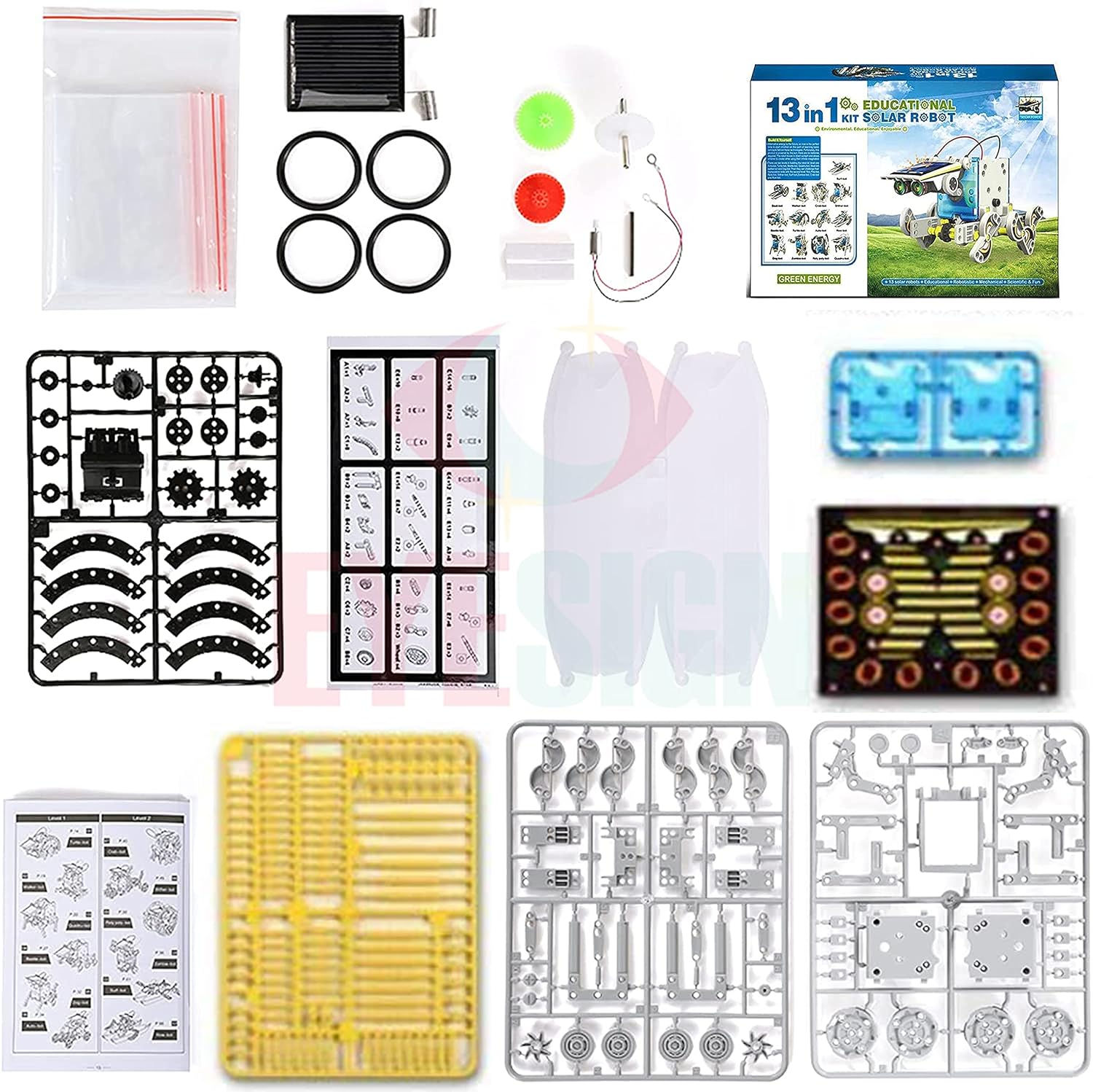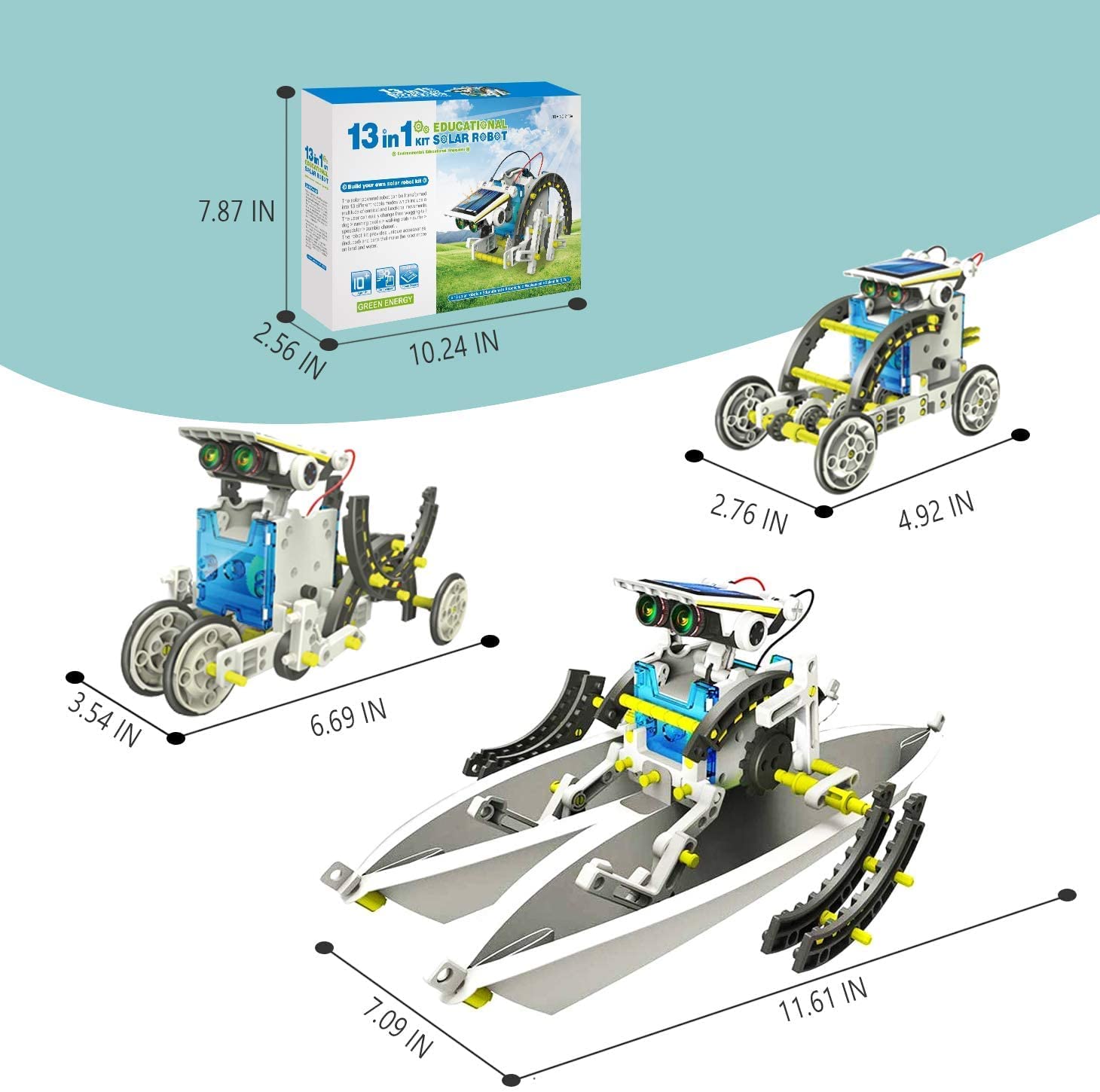 13-in-1 Solar Robot Kit: This solar robot toy could be built into 13 different shapes of robots. It is composed of including moving and connecting parts like gears, plates, tires, and shafts. Kids can easily disassemble them after the building each robot.