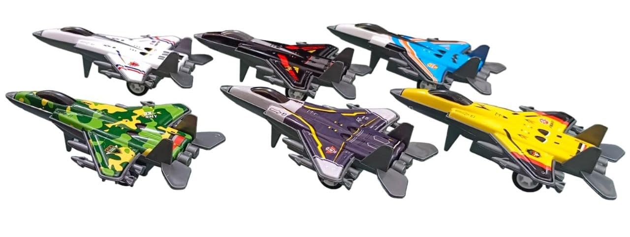 Set of 6 Fighter Jets : Our Mini Metal Racing Fighter Jets Set includes six uniquely designed fighter jets, each with its own distinct look, providing a variety of options for imaginative play and collection.